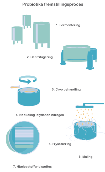 Produktionen af probiotika foregår i flere trin. Først skal bakterierne opformeres ved fermentering. Herefter centrifugeres de for at fjerne så meget vand som muligt. Så skal de beskyttes af en bestemt blanding af stoffer, som kaldes cryo, hvorefter de nedfryses. Hvis bakterierne fremstilles til tabletter, i pulver eller lignende skal de frysetørres, hvorefter de males til fint pulver, hvori der blandes hjælpestoffer. Derudover er produktionen af kosttilskudsprodukter under omfattende kvalitetskontrol.