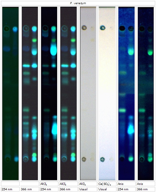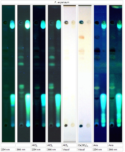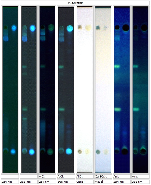 Y Metabolitterne dannes bedst på YES; H Metabolitterne ses ikke som veldefinerede pletter, men som haler.; DI Detekteres ikke under de givne betingelser; 365 Farven ses under UV lys 365 nm; 254 Farven ses under UV lys 254 nm; VIS Farven ses ved synligt lys.
