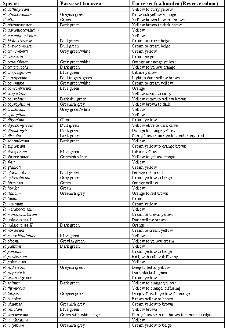 Denne oversigt beskriver hvilke metabolitter de enkelte Penicillium stammer producerer. Den kan også benyttes til at identificere svampe med.