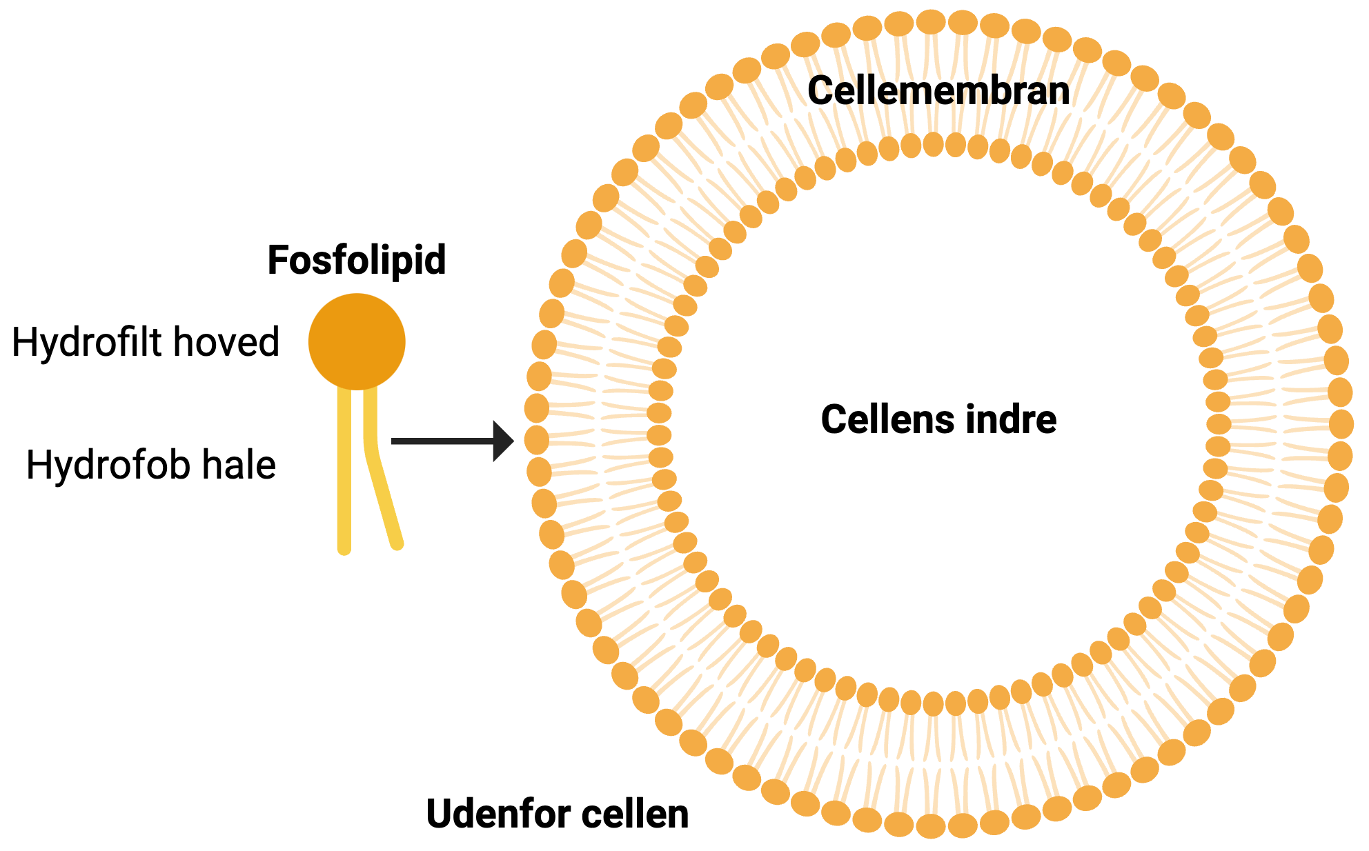Amfifil er betegnelsen for et molekyle, som består af en hydrofil (vandelskende/polær) del og en hydrofob (vandafskyende/upolær) del. Et eksempel er fosfolipider, som er hovedkomponenten i cellemembraner. Her er de hydrofile hoveder placeret udad mod det omgivende vandige miljø, mens de hydrofile haler vender ind mod hinanden og danner et dobbeltlag. Figur 1 viser den amfifile opbygning af et fosfolipid, der opbygger cellemembraner.