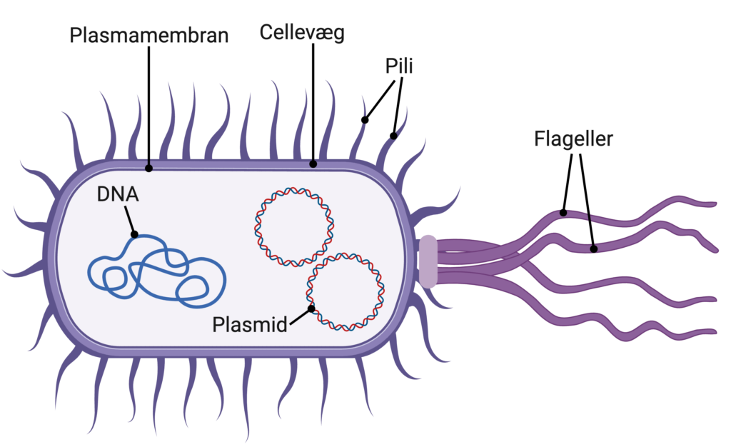 Figur 1. Bakteriens opbygning. Bakterier indeholder arvemateriale i form af fritflydende, cirkulært DNA og plasmider. Grampositive bakterier er omgivet af en plasmamembran og en tyk cellevæg. Derudover kan bakterier være beklædte af pili, som er en slags hårlignende struktur, bakterier bruger til at skabe kontakt til andre bakterier. Nogle bakterier har også flageller, der er en slags hale, som får bakterien til at bevæge sig.