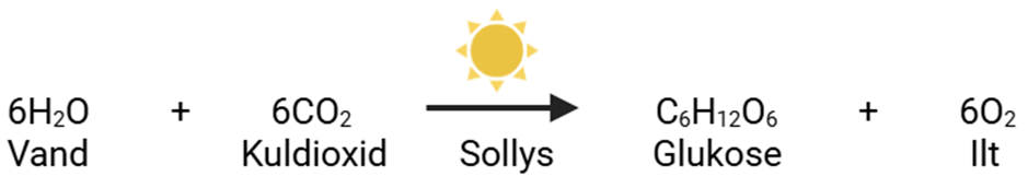 Proces, hvor planter, alger og nogle bakterier bruger sollys til at omdanne vand (H₂O) og kuldioxid (CO₂) til glukose og ilt (O₂).