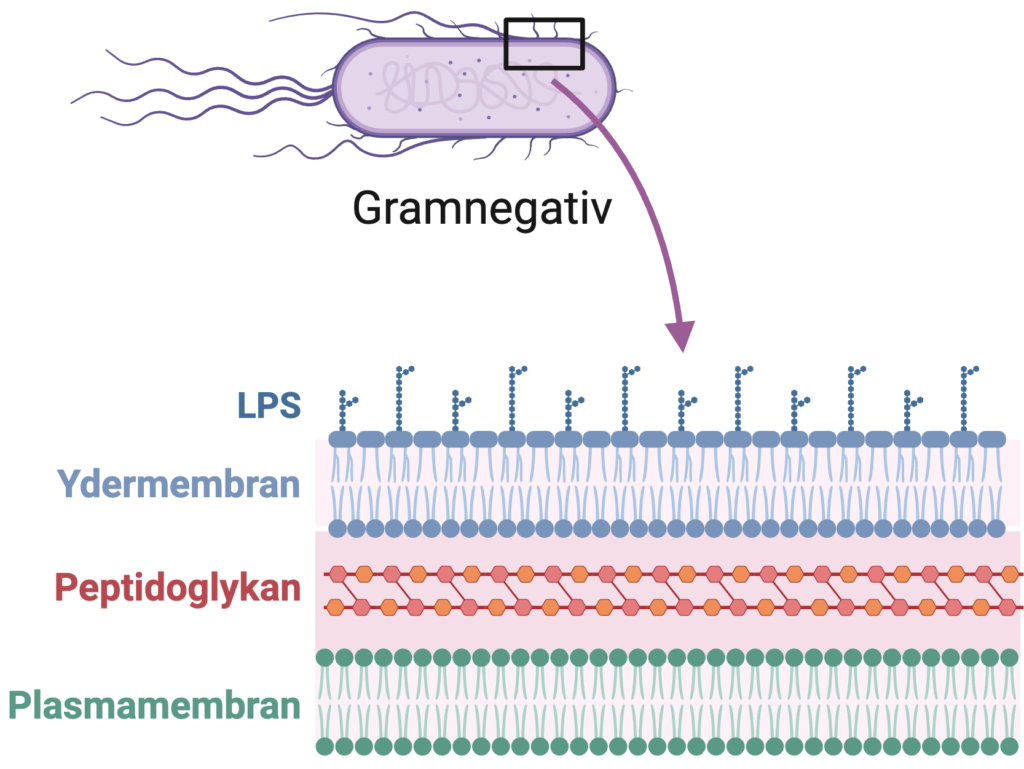 Bakterier inddeles i to grupper baseret på opbygningen af deres cellevægge. De kaldes grampositive og gramnegative bakterier. Gramnegative bakterier er betegnelsen for bakterier såsom E. coli og Salmonella, der er omgivet af fire dele: En plasmamembran, en cellevæg, en ydermembran og LPS (lipopolysakkarid). På figur 1 ses opbygningen af gramnegative bakteriers overflader.