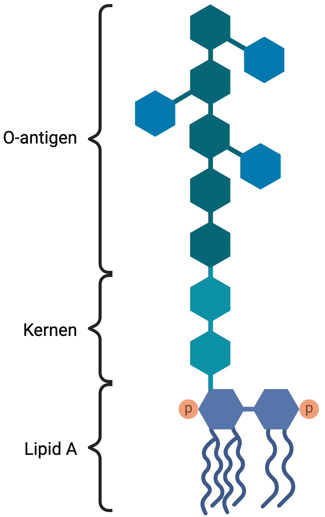 Figur 2. LPS. LPS, som står for lipopolysakkarid, er et molekyle, der består af et lipid (Lipid A) og sukkerstoffer (kernen og O-antigen), og det er en vigtig komponent på gramnegative bakteriers overflader.