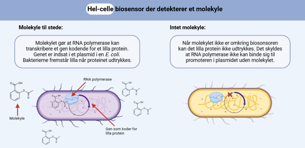 Figur 1: Et eksempel på en hel-celle biosensor, hvor der gøres brug af et reportergen til signalering om et molekyle er til stede. Se figur for uddybning.