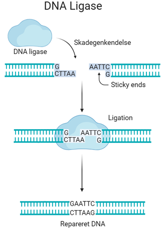 Figur 1: Ligase forbinder DNA-fragmenter med sticky ends til ét DNA-molekyle.