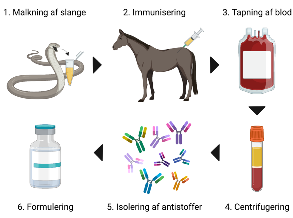 Modgiften produceres ved at vaccinere store dyr, såsom heste, med denne gift. Denne proces kaldes immunisering. At immunisere betyder, at man vaccinerer dyret med tiltagende mængder gift over længere tid. Dette gør, at dyrets immunforsvar selv danner antistoffer mod giftstofferne. Dernæst tapper man blod fra dyret, opdeler det i blodceller og plasma ved centrifugering, hvorefter man kan isolere antistofferne som dyret har produceret fra blodplasmaer. Det er netop disse antistoffer, man bruger som modgift mod slangegiften, og som har reddet tusindvis af liv. Figur 1 illustrerer processen for dannelse af modgift til slangebid.