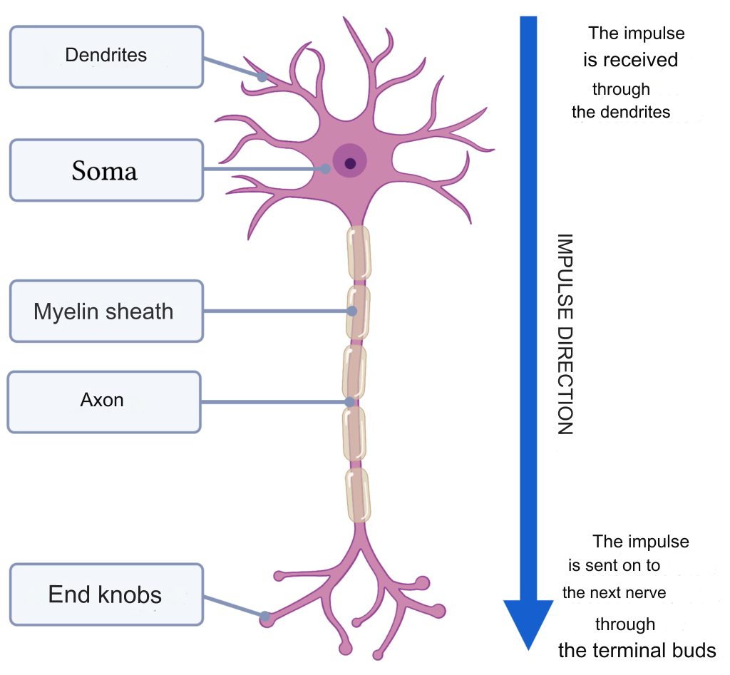 When nerve cells communicate with each other, they use electrical signals. The signal that goes from one nerve cell to another nerve cell is called an impulse. A nerve cell receives the impulse through the dendrites and sends it further along the axon. At the end buds, the impulse is passed on to the next nerve cell. This is how nerve cells constantly send information in the form of impulses around the body. In figure 1 you can see the structure and direction of a nerve cell.