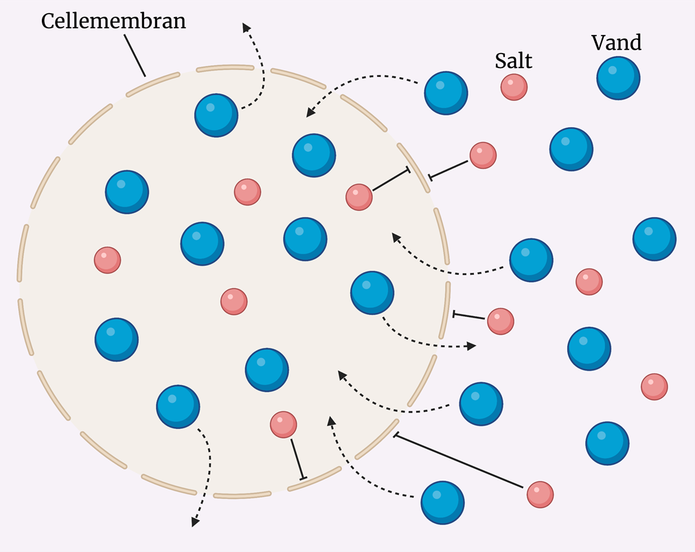 Figur 1. Cellemembranen tillader direkte ind- og udgang af vandmolekyler. Saltmolekyler kan ikke passere direkte gennem membranen.
