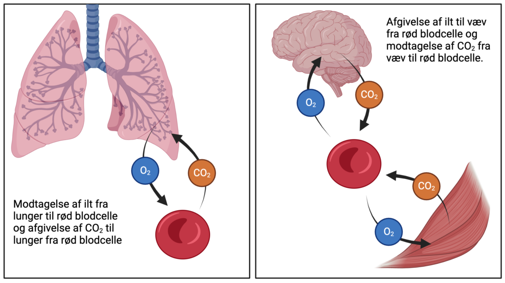 Røde blodceller har til opgave at transportere ilt rundt i kroppen. De modtager ilten i lungerne, hvorefter de transporterer det ud til kroppens væv. I vævet afgiver de ilten og optager herefter CO2, der transporteres tilbage til lungerne for at blive udåndet. Figur 1 illustrerer denne proces.