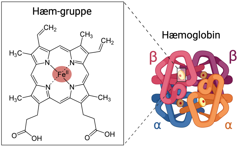 Jernionerne i hæmoglobin er det sted, hvor ilten bindes, når den transporteres rundt i kroppen. Når ilt ikke er bundet, indeholder hæm-gruppen ionen Fe2+ (ferrojern). Så snart ilt bindes, oxideres jernionen til Fe3+ (ferrijern), og den kan ikke binde yderligere iltmolekyler, før den er reduceret tilbage til Fe2+.