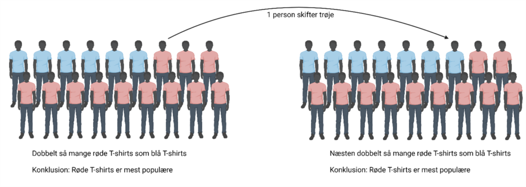Lad os se på et eksempel. Du vil gerne undersøge, om din klasse går mest i røde eller blå T-shirts. Du vælger derfor at tælle, hvor mange i din klasse som har taget en rød eller blå T-shirt på i dag. Til venstre på figur 1 kan du se resultatet. Der er 2 som har taget en blå T-shirt på, og 4 som har taget en rød T-shirt på. Der er altså dobbelt så mange, som har røde T-shirts i forhold til blå T-shirts. Du konkluderer derfor, at din klasse går mest i røde T-shirts.
